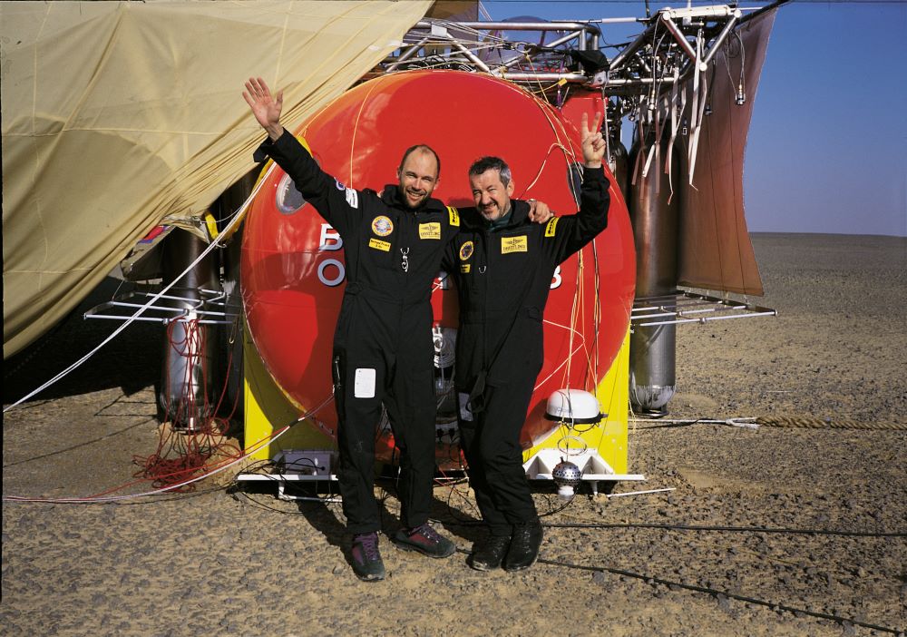 On March 21, 1999, hot air balloon pilots Bertrand Piccard and Brian Jones landed the Breitling Orbiter 3 hot air balloon in the Egyptian desert, becoming the first people to complete a non-stop round-the-world flight in a hot air balloon. The two pilots flew 45,633 kilometers (around 28,355 miles) over a period of 19 days, 21 hours, and 47 minutes, setting records for the longest flight distance and duration.
